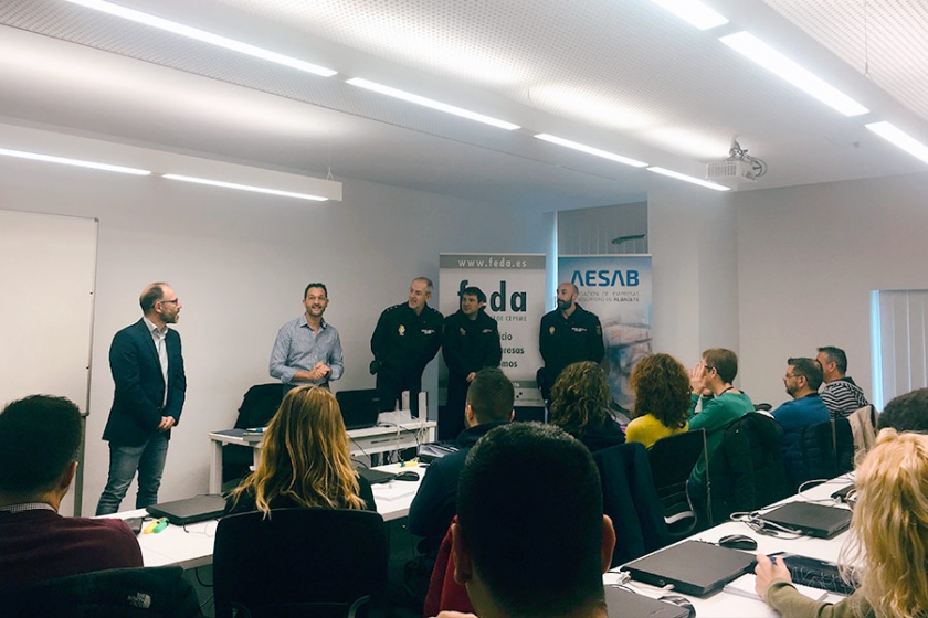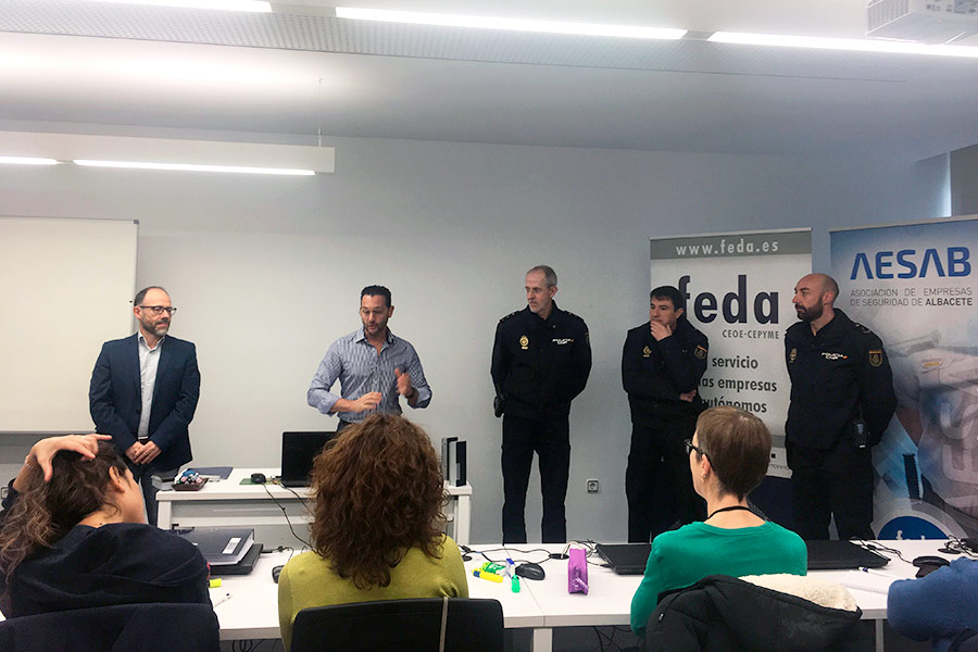Miembros de la Brigada de Seguridad Ciudadana del Cuerpo Superior de Policía Nacional, al frente el jefe de la misma, Salvador Garrido, visitaron la sede de la Confederación de Empresarios de Albacete, FEDA, en concreto el aula donde se imparte el Certificado de Profesionalidad de Vigilancia, Seguridad Privada y Protección de Personas, curso convocado por FEDA y financiado por la Junta de Comunidades de Castilla La Mancha y el Ministerio de Trabajo, Migraciones y Seguridad Social.