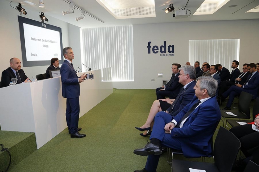 Vicente García fue informando sobre Escuela de Negocios FEDA, los programas formativos, jornadas y otras iniciativas llevadas a cabo durante 2018, al igual que otros servicios como la bolsa de empleo, la asesoría en diferentes áreas o el Departamento de Comunicación que visibiliza la vida de la Confederación, resaltando al mismo tiempo el crecimiento de la Confederación en Internet y en las redes sociales.