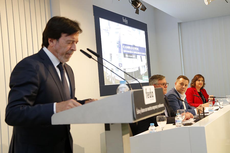 El presidente de FEDA, como cada año, hizo su informe en la Asamblea General de la Confederación, poniendo en valor la organización y con ella al conjunto de los empresarios asociados, sus 72 asociaciones, a la Junta Directiva, al Comité Ejecutivo, a las delegaciones y sus juntas locales y al “gran” –dijo- equipo técnico, en el que el 80 por ciento está desarrollado por mujeres.