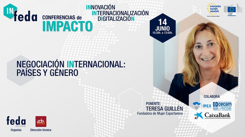 El próximo viernes, día 14 de junio, finaliza el ciclo IN-FEDA Conferencias de Impacto, con la sesión referida a negociación internacional, países y género. Se desarrollará de 10,30 a 13,00 horas, en la sede de la Confederación en Albacete (c/ de los Empresarios, 6). Esta última conferencia cuenta con la colaboración de IPEX y CECAM y CaixaBank como patrocinador preferente, y la dirección técnica de ADIEX.
