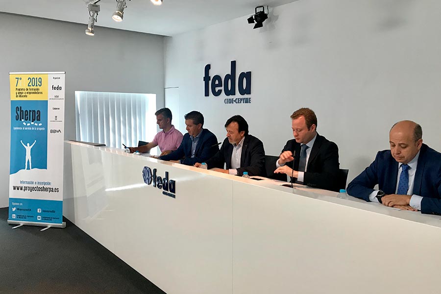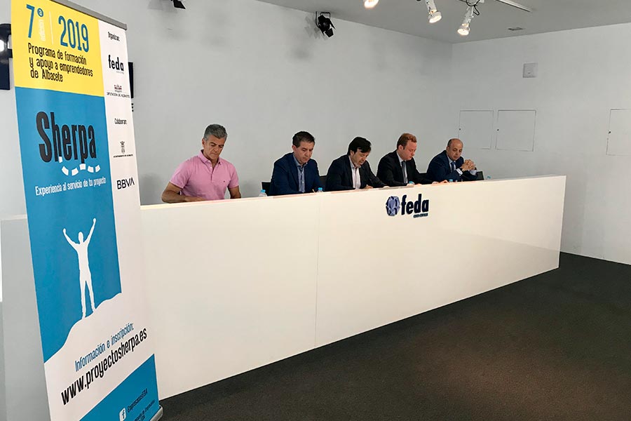 Los emprendedores de la provincia de Albacete, aquellas personas que tengan el sueño de hacer realidad una aventura empresarial, tienen una nueva cita con el Programa Sherpa. La VII Edición ha sido presentada esta mañana por el presidente de FEDA, Artemio Pérez Alfaro; junto al presidente de la Diputación, Santiago Cabañero; el alcalde de Albacete, Vicente Casañ y Fernando Gimeno, director de Centro de Banca de Clientes de Albacete Ciudad de BBVA, instituciones y entidad que forman parte de este programa de apoyo a emprendedores.