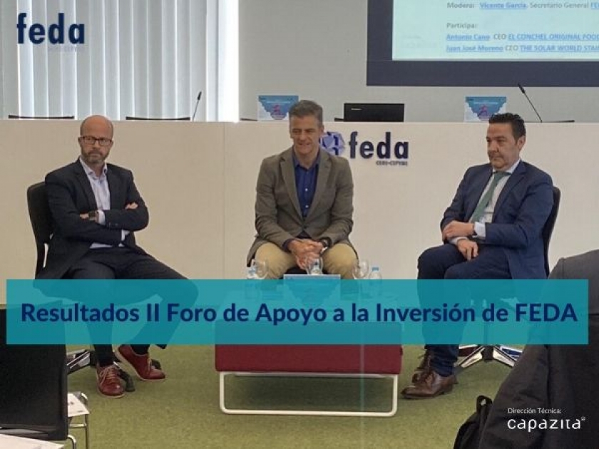 El pasado viernes 28 de febrero la sede de FEDA acogió el II Foro de Apoyo a la Inversión organizado por el Departamento de Asociaciones y Áreas Técnicas de FEDA en colaboración con Banco Sabadell y Capazita.
