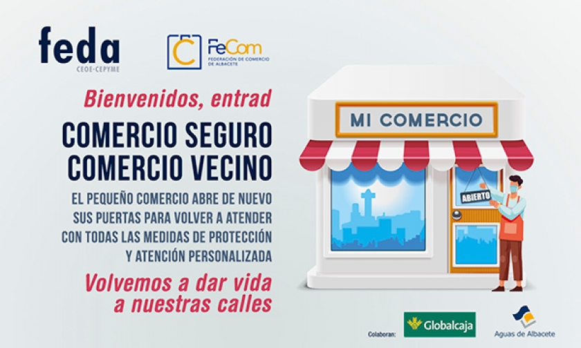 La Federación de Comercio de Albacete, FECOM, integrada en FEDA, junto con el patrocinio de Globalcaja y Aguas de Albacete, en la vuelta a la actividad del comercio de Albacete, lanza la campaña “Comercio seguro, comercio vecino”, con la que quiere acompañar a los comerciantes invitando a los ciudadanos a volver a entrar, a comprar, dejándoles constancia que es un establecimiento seguro en cuanto a las normas sanitarias.
