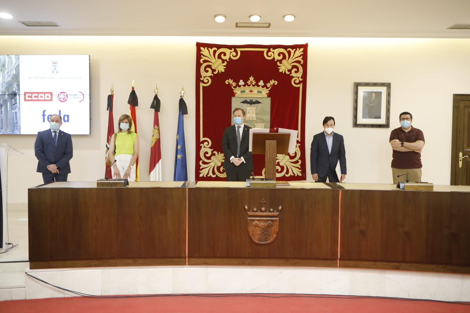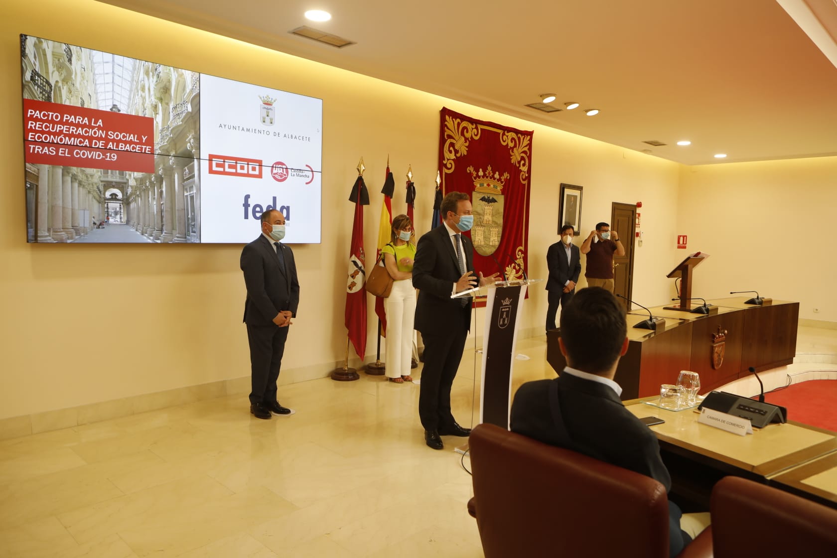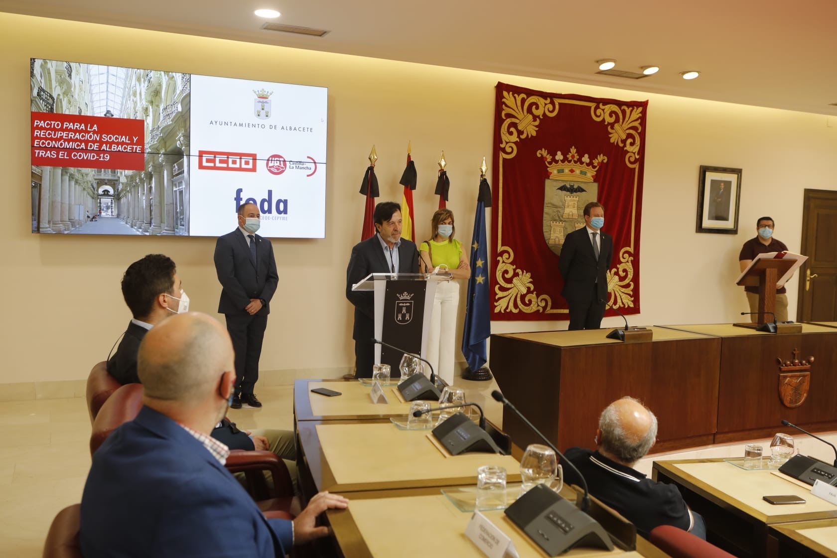 El salón de plenos del Ayuntamiento de Albacete ha acogido hoy la firma del “Pacto por la Recuperación Social y Económica de Albacete”, un instrumento dotado con 19,2 millones de euros, que ha sido rubricado por el alcalde, Vicente Casañ; el presidente de FEDA, Artemio Pérez Alfaro; la secretaria provincial de CCOO, Carmen Juste; y el secretario provincial de UGT, Javier González, siendo testigo de esta rúbrica el vicealcalde, Emilio Sáez.