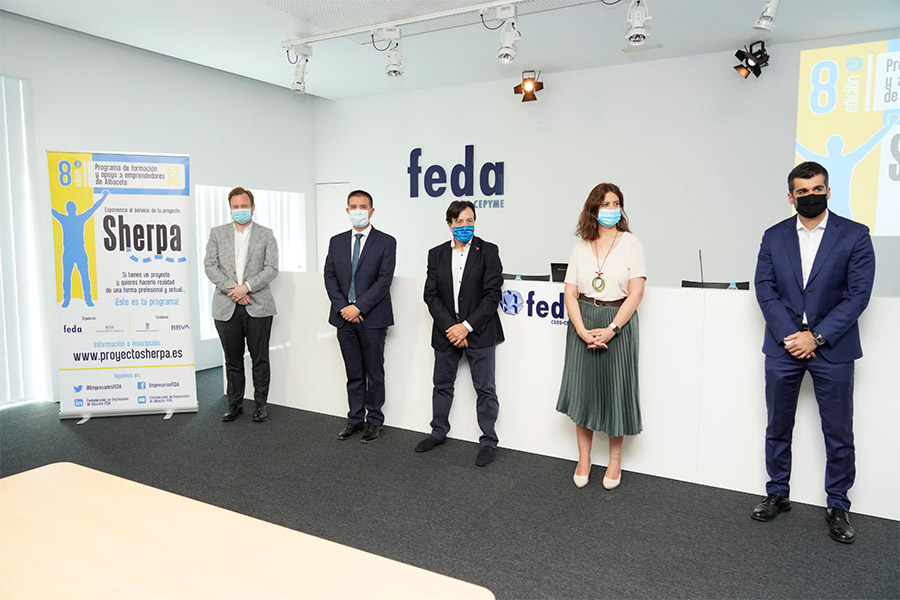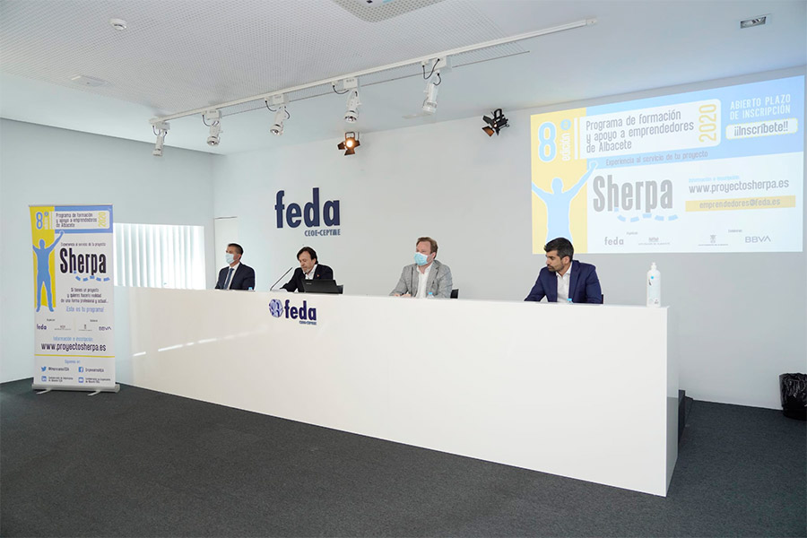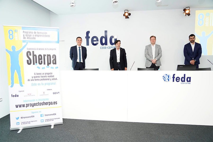Los emprendedores de la provincia de Albacete, aquellas personas que tengan el sueño de hacer realidad una aventura empresarial, tienen una nueva cita con el Programa Sherpa. La VIII Edición ha sido presentada esta mañana por el presidente de FEDA, Artemio Pérez Alfaro; junto al presidente de la Diputación Provincial de Albacete, Santiago Cabañero; el alcalde de Albacete, Vicente Casañ y Christian García Blázquez, director comercial de pymes de BBVA en Albacete, instituciones y entidad que forman parte de este programa de apoyo a emprendedores.