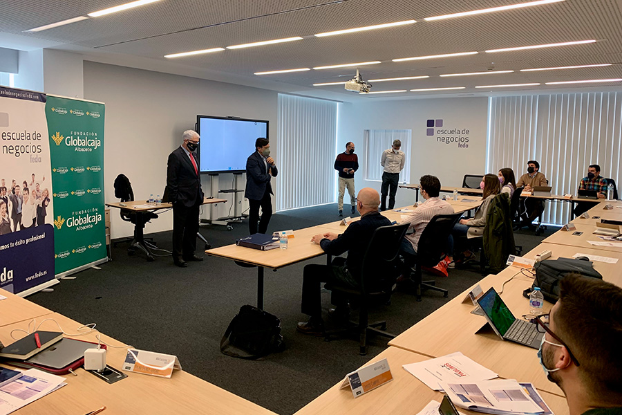 Aprovechando el último día de clase presencial, fueron despedidos, igual que recibieron la bienvenida en el aula Artemio Pérez, presidente de la Confederación de Empresarios de Albacete, FEDA, y Francisco Martínez Ortuño, director General de Fundación Globalcaja-Albacete, colaborador global de Escuela de Negocios FEDA.