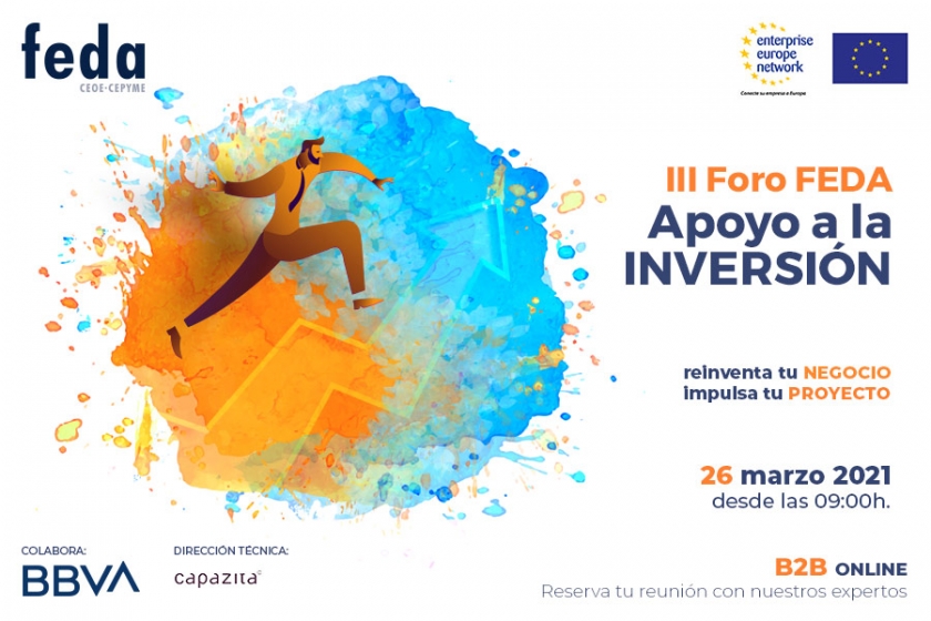 Para el viernes, día 26 de marzo, FEDA y su Enterprise Europe Network, han convocado el III Foro de Apoyo a la Inversión, con la colaboración de BBVA y la dirección técnica de Capazita. Será en horario de mañana de 9,00 horas a 13,00 horas, en la sede de la Confederación (c/ de los Empresarios, 6) en Albacete.