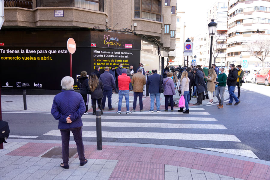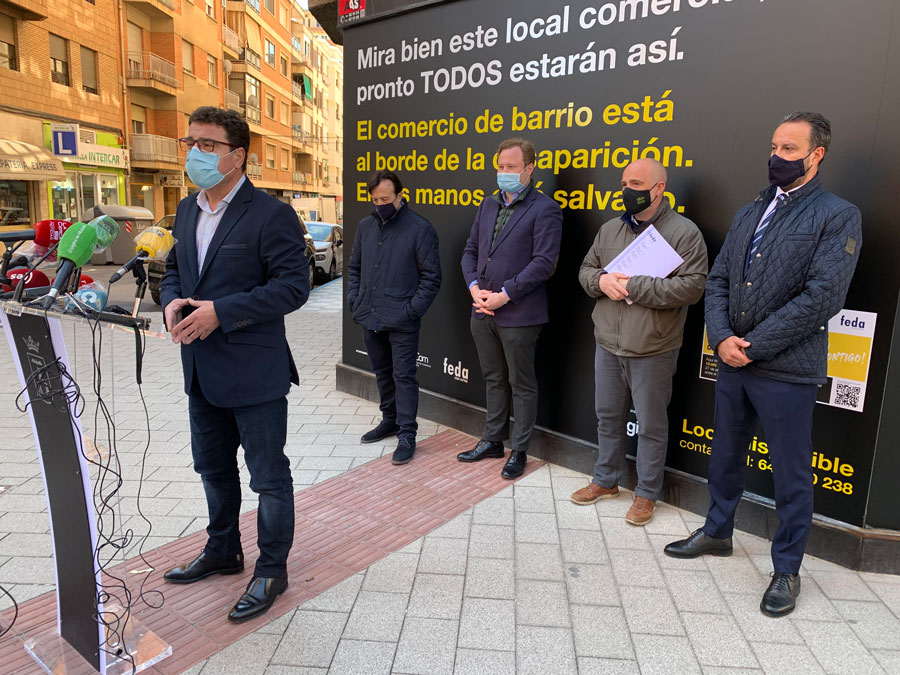 Por su parte, el presidente de FEDA, Artemio Pérez, ha comenzado su intervención recalcando el gran esfuerzo que ha hecho FECOM para hacer posible esta campaña que ayudará a todo el comercio de la ciudad, de todos los barrios, y ha agradecido la implicación de la Asociación de Gestores Inmobiliarios que ha seleccionado a los mejores locales comerciales cerrados para exhibir los vinilos en negro que tratan de poner en situación a la ciudadanía.