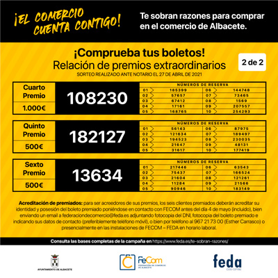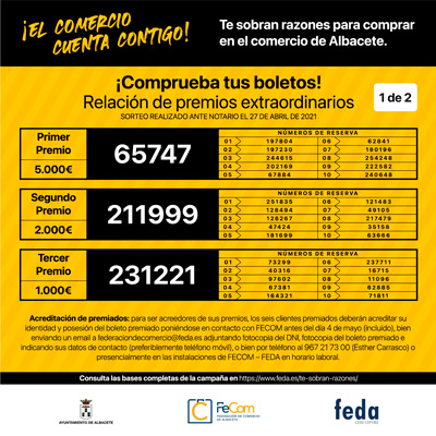 Para ser acreedores de sus premios, los seis clientes premiados deberán acreditar su identidad y posesión del boleto premiado poniéndose en contacto con FECOM antes del día 4 de mayo (incluido), bien enviando un email a federaciondecomercio@feda.es adjuntando fotocopia del DNI, fotocopia del boleto premiado e indicando sus datos de contacto o presencialmente en la sede de FECOM, en FEDA (c/ de los Empresarios, 6).