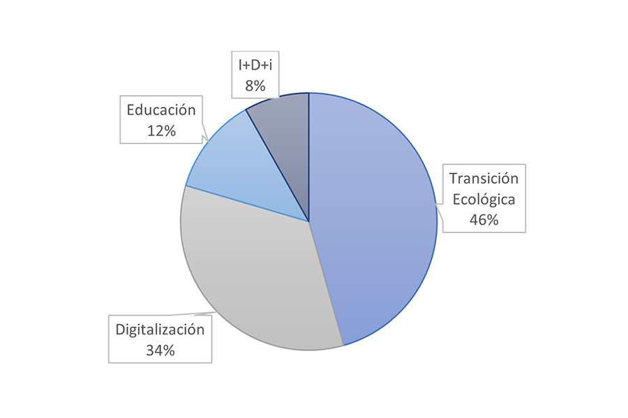 Alrededor del 80% de los fondos irán destinados a la Transición Ecológica y la Mejora de la Digitalización, tanto de Administraciones como de PYMES.