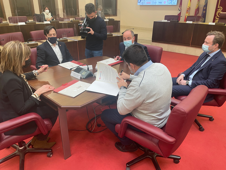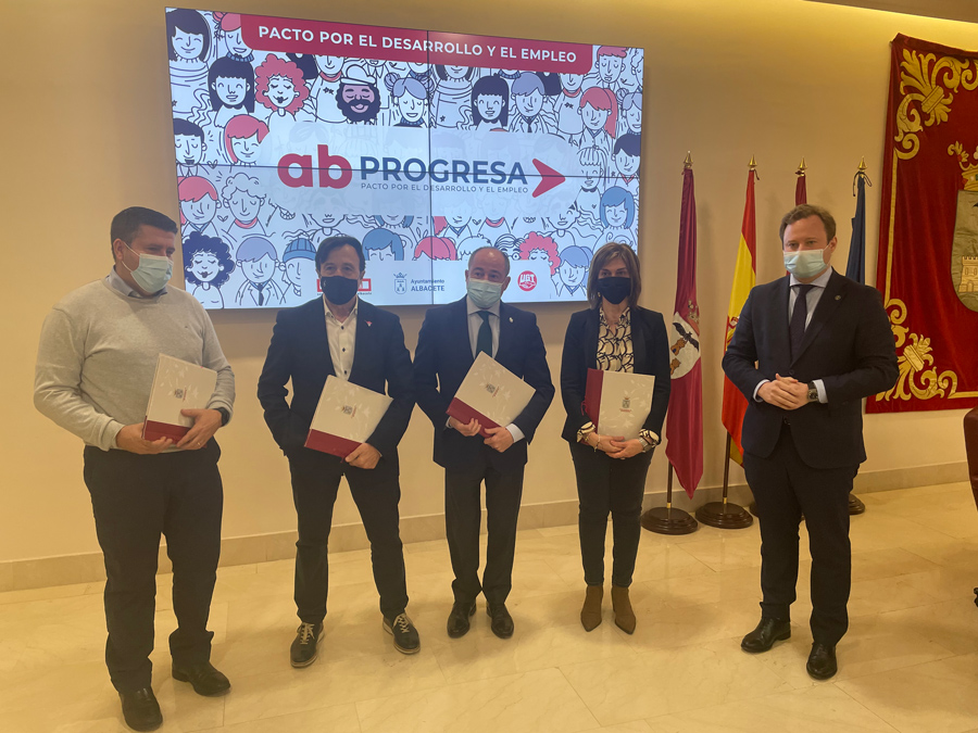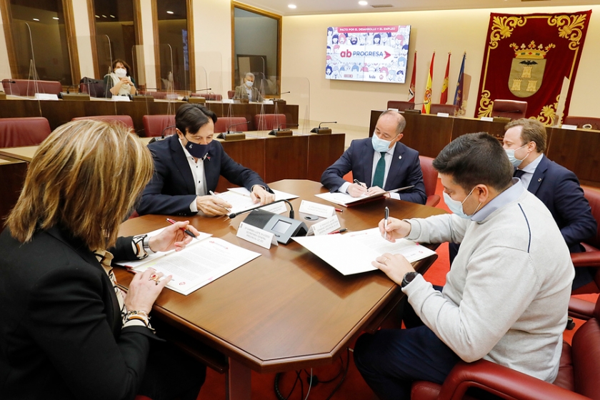 Albacete, 11 de marzo de 2022. El alcalde de Albacete, Emilio Sáez, ha firmado esta mañana el Pacto por el Desarrollo y el Empleo ‘Albacete Progresa’ con la Confederación de Empresarios de Albacete (FEDA) y con los sindicatos CCOO y UGT, con el que se fijarán las apuestas de crecimiento económico de la ciudad para el bienio 2022-2023.