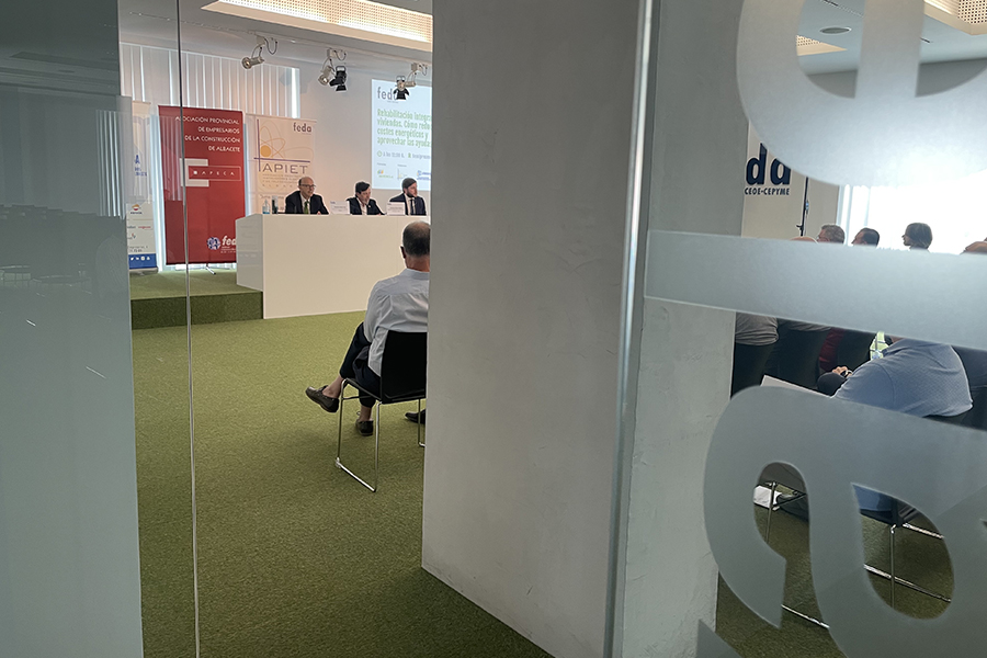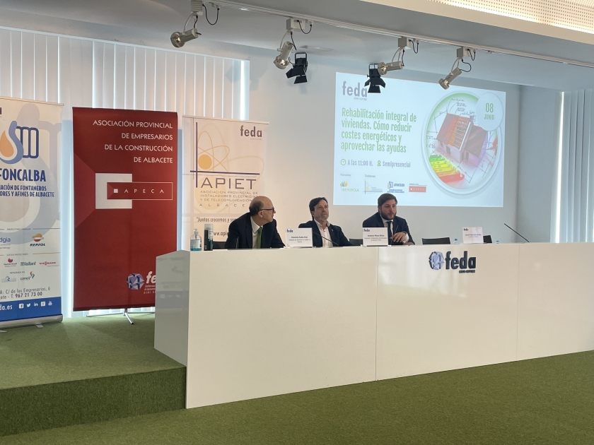 El consejero de Fomento ha clausurado la Jornada dedicada a la rehabilitación integral de viviendas, organizada por la Confederación de Empresarios de Albacete, FEDA, y en la que ha participado junto al presidente de FEDA, Artemio Pérez; y el delegado de la Junta en Albacete, Pedro Antonio Ruiz Santos, así como los presidentes de AFONCALBA, Juan Manuel García García, y el presidente de APIET, Jesús Núñez Pérez, junto al delegado de Iberdrola en Castilla-La Mancha, Venancio Rubio.