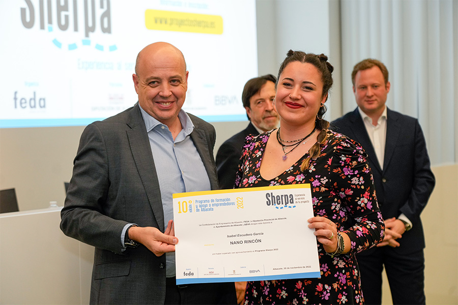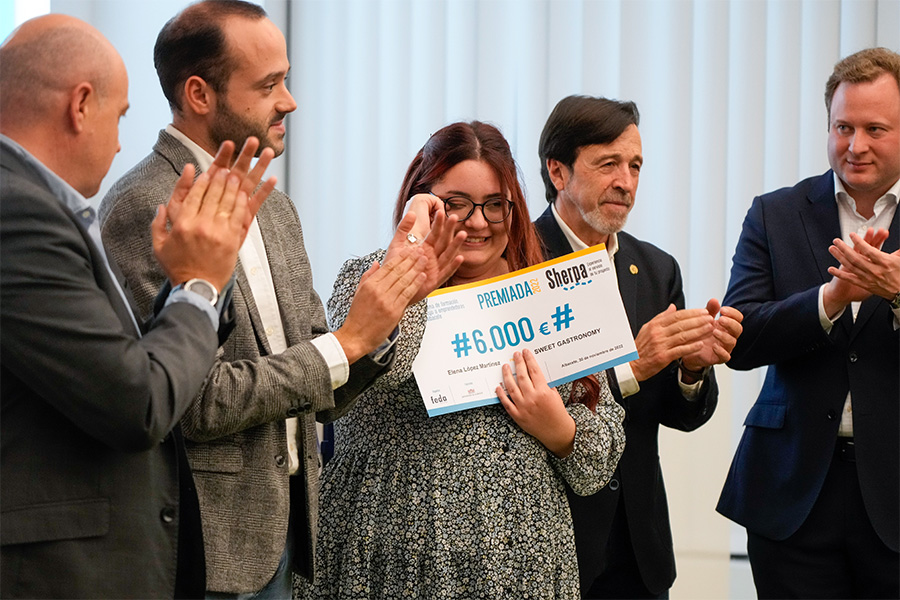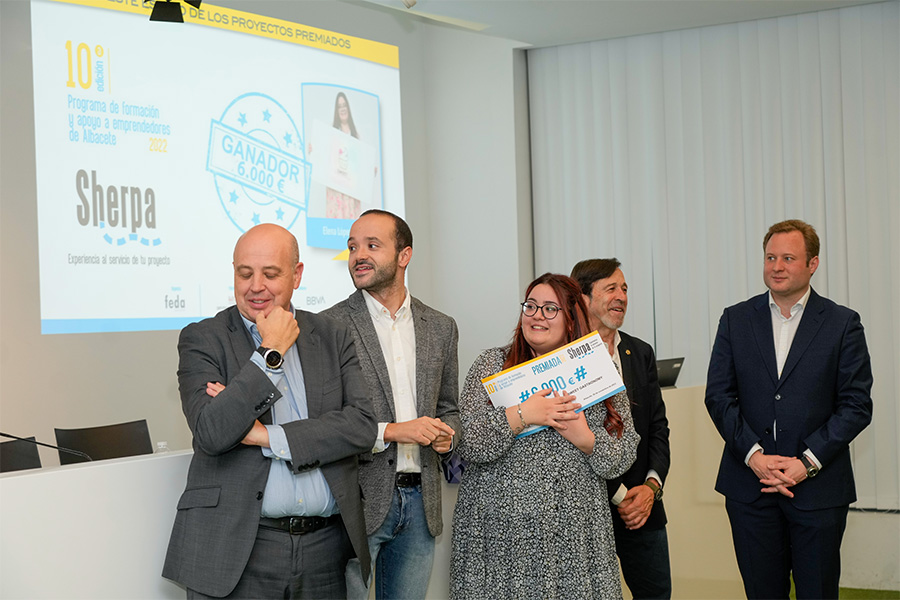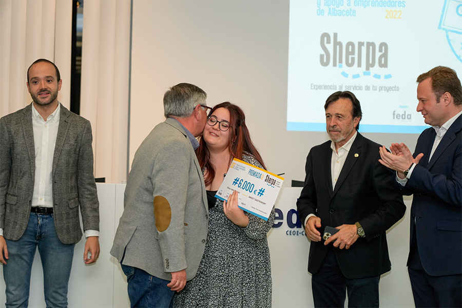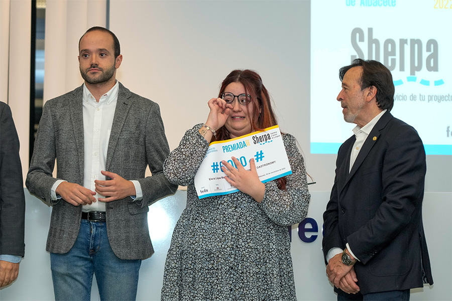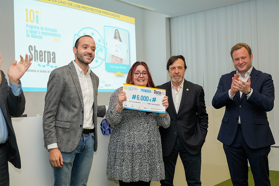 Elena López Martínez, con su proyecto ‘Sweet Gastronomy’ (Hellín), fue la ganadora de la décima edición del Programa Sherpa de apoyo a emprendedores liderado por la Confederación de Empresarios de Albacete, FEDA, con la colaboración de la Diputación Provincial, el Ayuntamiento de Albacete y BBVA. Se llevó un premio de 6.000 euros, más otros 6.500 euros adicionales aportados por el Ayuntamiento de Hellín, debido a que se trata de un proyecto ubicado en dicha ciudad. ‘Sweet Gastronomy’ es una pastelería creativa en la que recrean momentos en tartas completamente personalizadas, con servicio de cafetería en la que ofrecen productos caseros, un amplio surtido de tostadas, cafés, tés y zumos ecológicos.