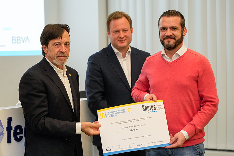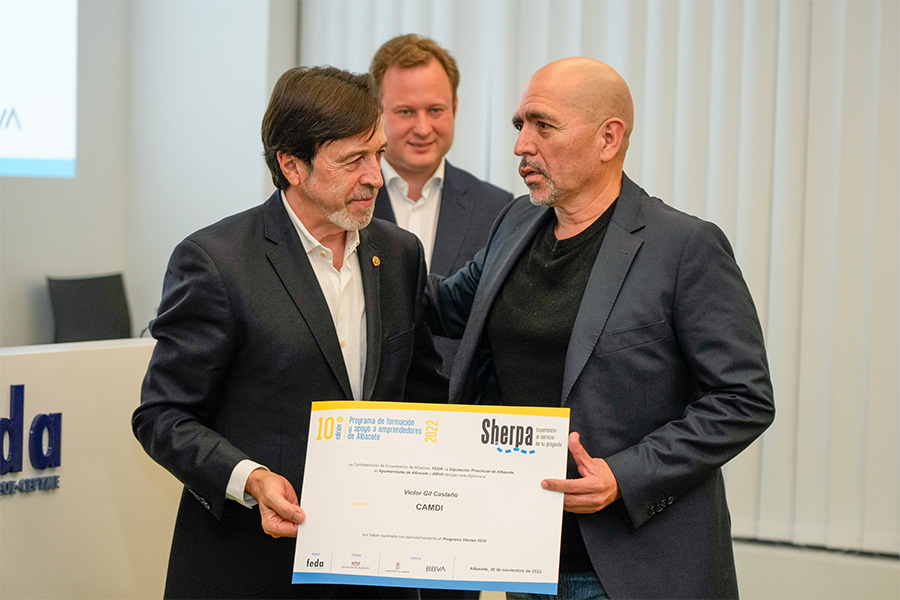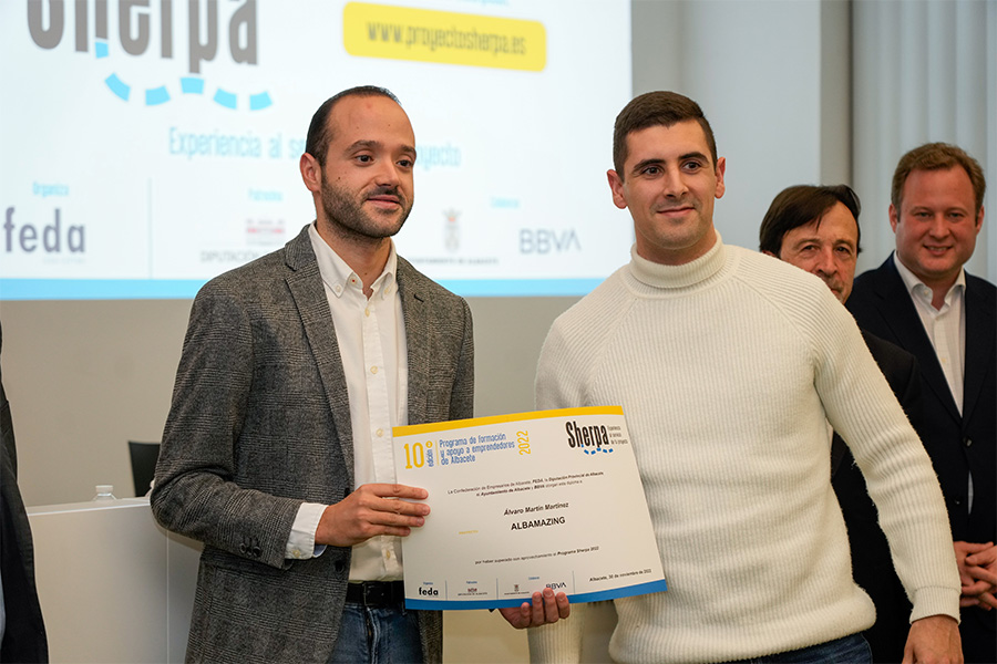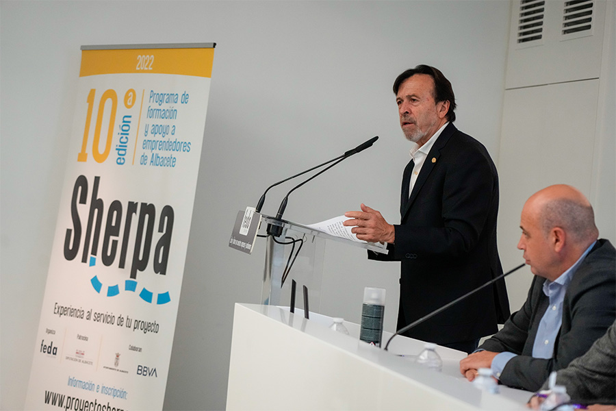 El apoyo de Diputación Provincial, Ayuntamiento de Albacete y BBVA quedó plasmado una vez más en las diversas intervenciones que se realizaron. El vicepresidente de la Diputación de Albacete, Fran Valera, quiso destacar la importancia de la Educación y de la Formación a la hora de emprender, así como la capacidad de renovarse constantemente y de adaptarse a las nuevas realidades sin perder nunca la visión empresarial. Algo que, señaló, viene dado de la mano del Programa Sherpa, iniciativa que cuenta con el apoyo de la institución presidida por Santiago Cabañero desde su primera edición, y para cuyo décimo aniversario "quisimos hacer un esfuerzo extra patrocinando dos premios especiales (dotados con 3.000 € cada uno) para proyectos impulsados por mujeres del mundo rural y arraigados en localidades con menos de 5.000 habitantes. Iniciativa que lamentablemente ha quedado desierta pero que nos guardamos para el año que viene", aseveró, destacando que el apoyo a este programa "está garantizado porque somos conscientes de que desde las bases se construye el futuro". En este sentido, Valera recordó que, aunque la Diputación no tenga competencias directas en materia empresarial, sí las tiene cuanto a desarrollo provincial "y seguiremos trabajando por ello".