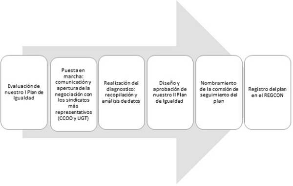Bajo la dirección técnica de Concialia2, como consultora soporte para el desarrollo del Plan, en FEDA se han seguido los siguientes pasos. Se empezó evaluando el primer Plan de Igualdad, para continuar con la puesta en marcha de esta segunda oportunidad con la comunicación y apertura de negociación con los sindicatos más representativos (CC.OO y UGT), realización del diagnóstico, recopilación y análisis de datos. El siguiente paso fue el diseño y aprobación del II Plan, se nombró la comisión de seguimiento y, finalmente, ha quedado registrado en el REGCOM.