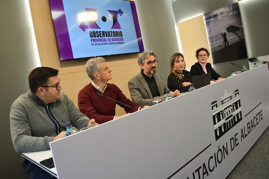 El tercer informe del Observatorio Provincial de Igualdad en las Relaciones Laborales ha sido presentado en la Diputación Provincial por los representantes de las instituciones y agentes sociales: Pedro Antonio González, diputado de Igualdad de Albacete; Amparo Torres, concejala Empelo, Formación y Agenda 2030 del Ayuntamiento de Albacete; Esther Ruíz Pérez, secretaria de Organización de CCOO; Francisco Javier González, secretario general de UGT, y Vicente García Martínez, secretario general de FEDA.