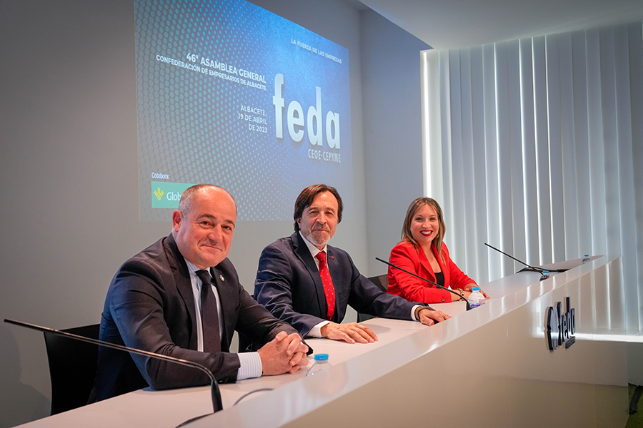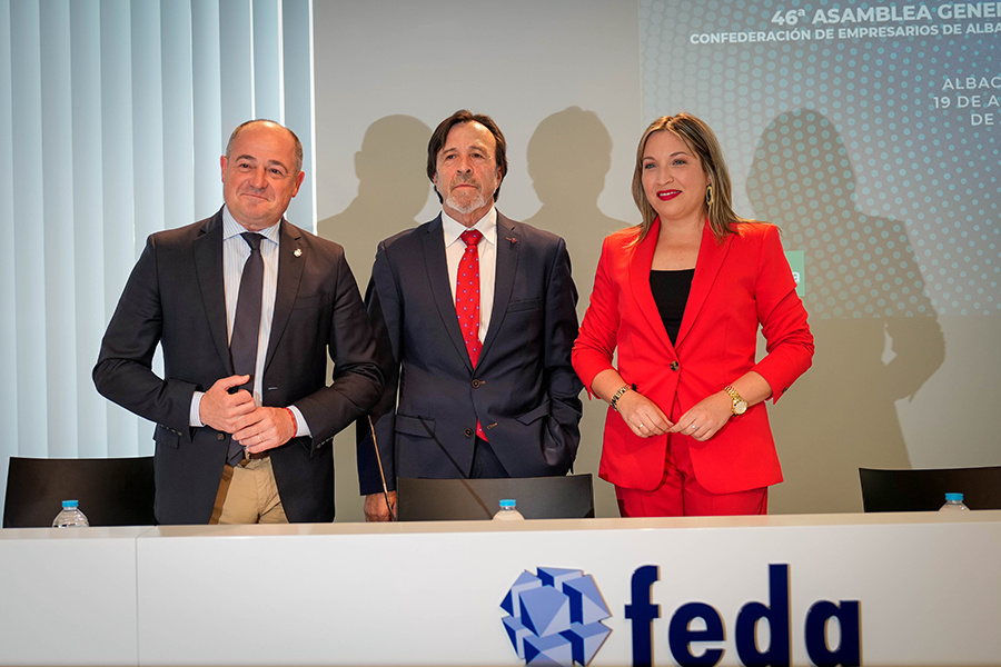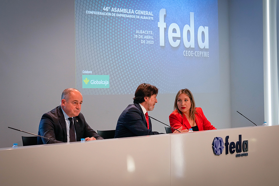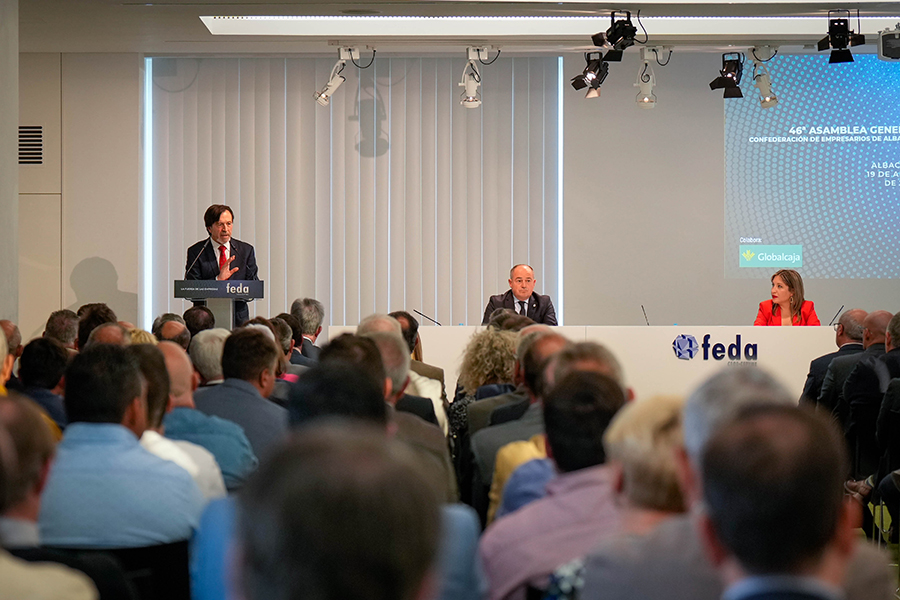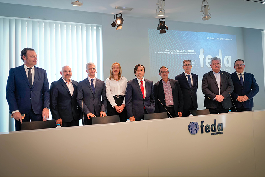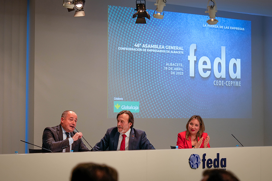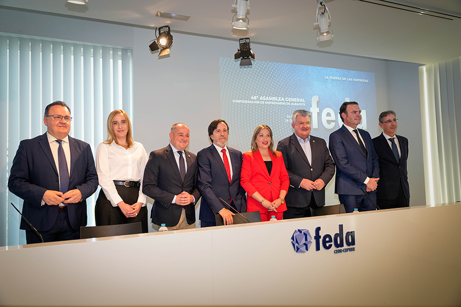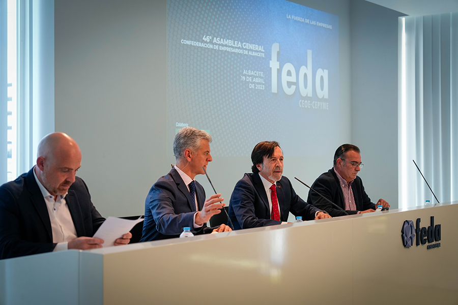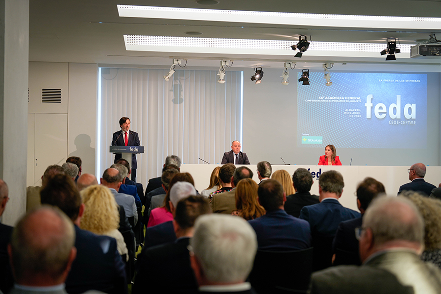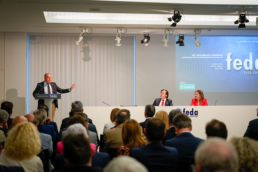 La Confederación de Empresarios de Albacete, FEDA, celebró su 46ª Asamblea General, un acto en el que el presidente de la organización, Artemio Pérez Alfaro, se mostró optimista de cara al futuro, aunque alertó de las posibles consecuencias de la sequía que sufrimos, reclamó una bajada de impuestos para pymes y autónomos y puso en valor el buen hacer del equipo de trabajo de FEDA, que un año más sigue al pie del cañón mejorando día a día los servicios que ofrece la Confederación a empresas, asociaciones, autónomos y autónomas.