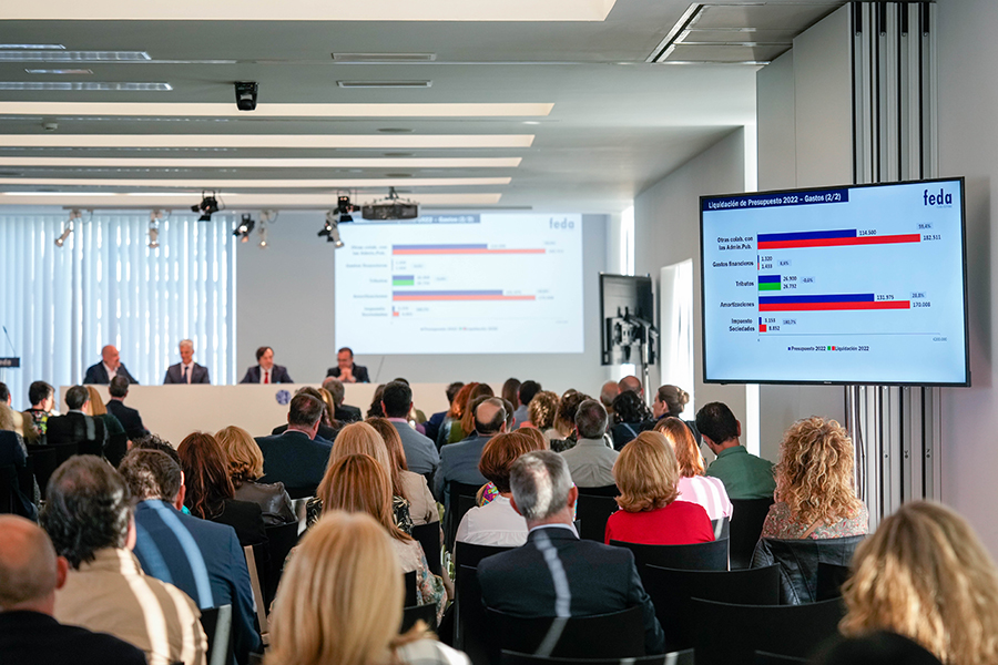 La sede de FEDA registró un lleno para esta Asamblea General. Más de un centenar de socios de la Confederación asistieron al acto, en el que se aprobaron por unanimidad las cuentas presentadas y el presupuesto de la Confederación para el año 2023.