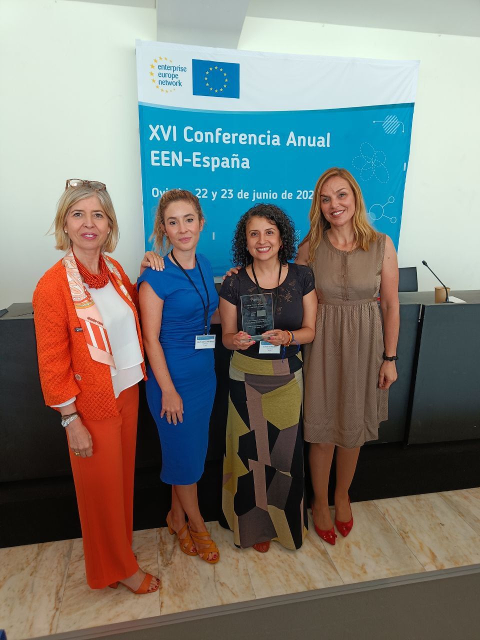 El premio fue entregado por la concejala de Gobierno de Economía, Transformación Digital y Políticas Sociales del Ayuntamiento de Oviedo, ciudad anfitriona de la XVI Conferencia Anual de Socios Españoles de la EEN este año, donde también estuvieron presentes Natalia Martínez Páramo, Head of Unit SMP/ SME Pillar European Innovation Council and SMEs Executive Agency (EISMEA), e Idaira Robayna Alfonso, Project Officer Enterprise Europe Network para España.