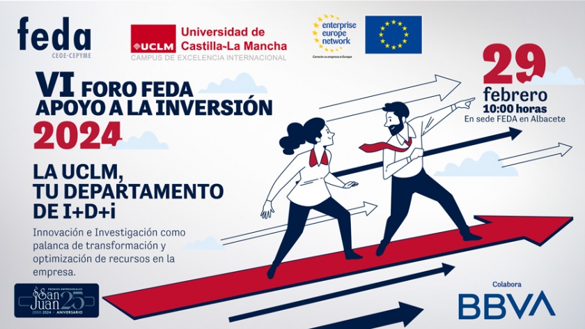 FEDA y la Oficina de Transferencia de los Resultados de Investigación, OTRI, de la UCLM, como nodos de la Enterprise Europe Network, y una vez más de la mano de BBVA, han convocado el VI Foro de Apoyo a la Inversión, La UCLM, tu Departamento de I+D+i, que tendrá lugar el próximo jueves, día 29 de febrero, en la sede de la Confederación, C/ De los Empresarios, 6, a partir las 10:00 horas.