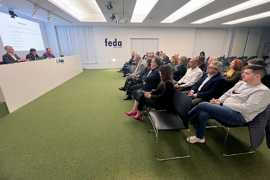 La reunión sirvió también para hacer un reconocimiento explícito al presidente, que el pasado día 23 de este mes de febrero cumplía 25 años al frente de FEDA, desde aquella Asamblea Electoral de 1999 y las sucesivas reelecciones, la última el año pasado coincidiendo con la misma fecha. Fue el vicepresidente Antonio Atiénzar quien hizo la semblanza y recordó momentos de estos, corroborados por José Ruiz, presidente de la Asociación de Industrias Agroalimentarias, que ya lo era entonces y que estaba presente en esta reunión.