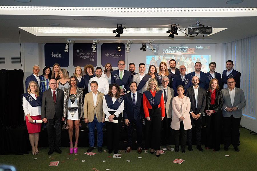 Cinco personas recibieron sus diplomas por el VII Programa Avanzado en Dirección Comercial, Marketing y Digital Business (DIRCOM) y otras 15 se diplomaron en el XIV Programa Máster en Dirección y Administración de Empresas (MBA Executive). En representación de todos ellos tomó la palabra Eva María Murcia Gómez, gerente del Grupo Murcia Asesoría Empresarial SL, diplomada en el MBA Executive, quien puso en valor al grupo, a la Escuela de Negocios FEDA, a la aportación que han recibido en la personal y en lo profesional, concluyendo “me ha cambiado la vida”. También hubo una mención especial para Francisco José Cebrián López, la persona con el mejor expediente académico de esta promoción.