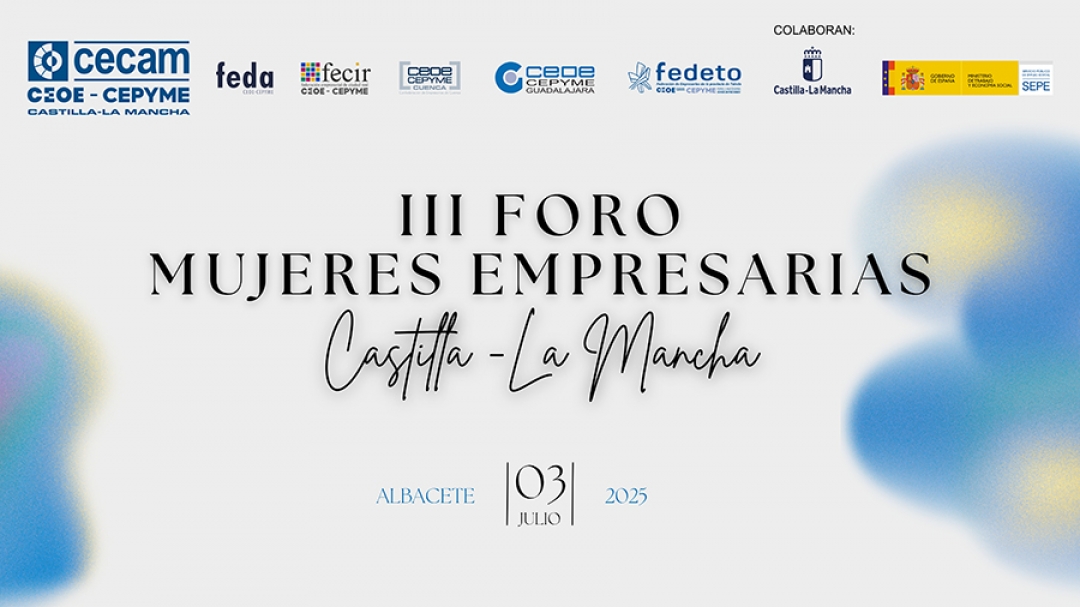 Con el objetivo principal de impulsar la figura de las mujeres empresarias de nuestra región y visibilizar la labor de las organizaciones empresariales a favor de las empresas en materia de igualdad, CECAM CEOE-CEPYME Castilla-La Mancha, en colaboración con sus organizaciones empresariales provinciales, celebrará por tercer año consecutivo el III Foro Mujeres Empresarias de Castilla-La Mancha, que tendrá lugar este próximo jueves 3 de julio, en la sede de FEDA, en Albacete (c/ de los Empresarios, 6).