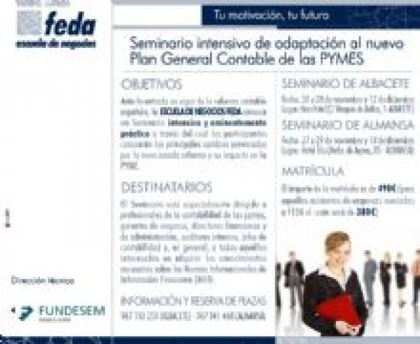 Ante la inminente entrada en vigor de las nuevas normas de valoración, reconocimiento y presentación contables (NIIF) y, en consecuencia, la reforma contable española, la Escuela de Negocios FEDA ha convocado un Seminario intensivo y eminentemente práctico, a través del cual los participantes conocerán los principales cambios provocados por la mencionada reforma y su impacto en la pyme, interpretarán los nuevos estados financieros (estado de flujos de efectivo y estado de cambios en el patrimonio neto) y se les proporcionarán herramientas para elaborarlos.