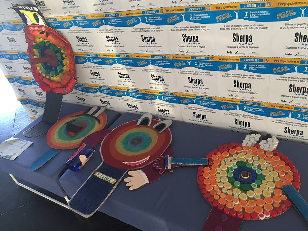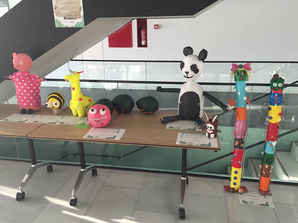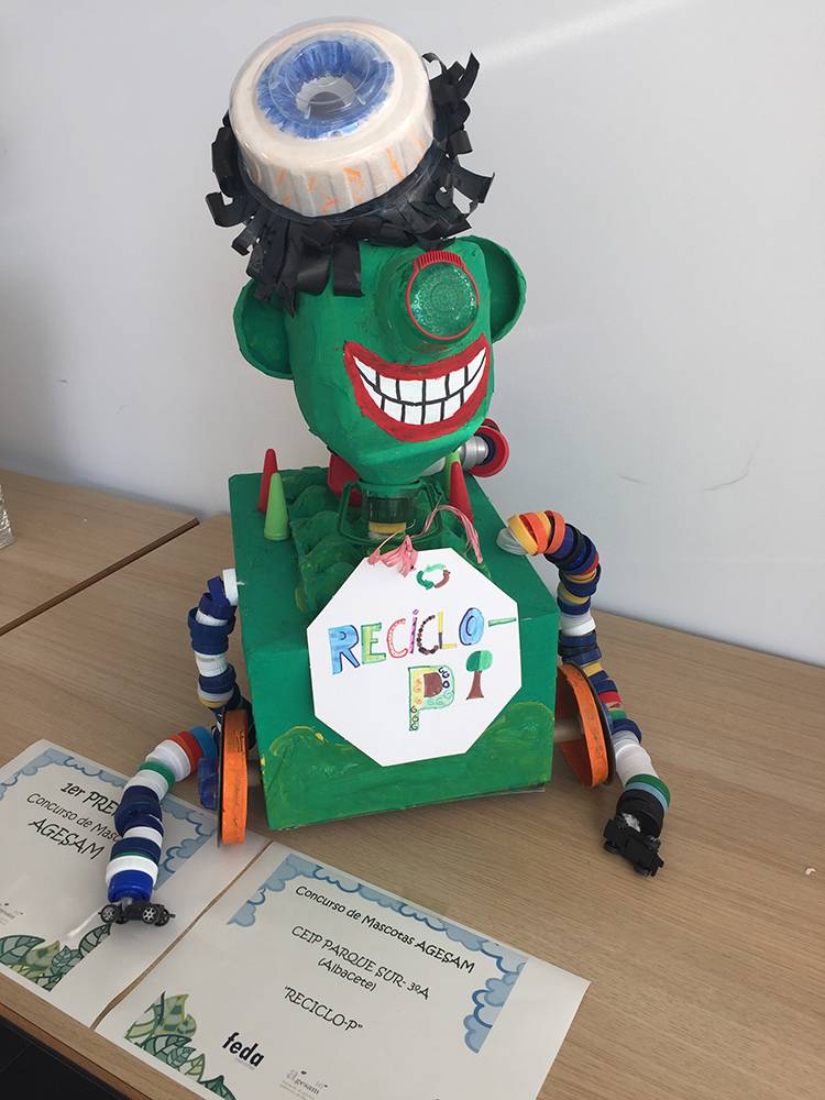 - 1er premio de 500 € à CEIP Parque Sur (Albacete). Su mascota RECICLO-P, realizada por los alumnos de 3ºA, es un ser fantástico que nos recuerda con su color (verde) y su mirada (el ojo que todo lo ve) las tres “erres” de la ecología: reducir, reutilizar y reciclar. Los materiales utilizados van desde el cartón de los huevos hasta juguetes rotos en desuso.