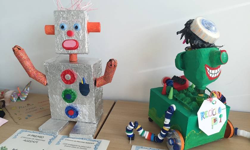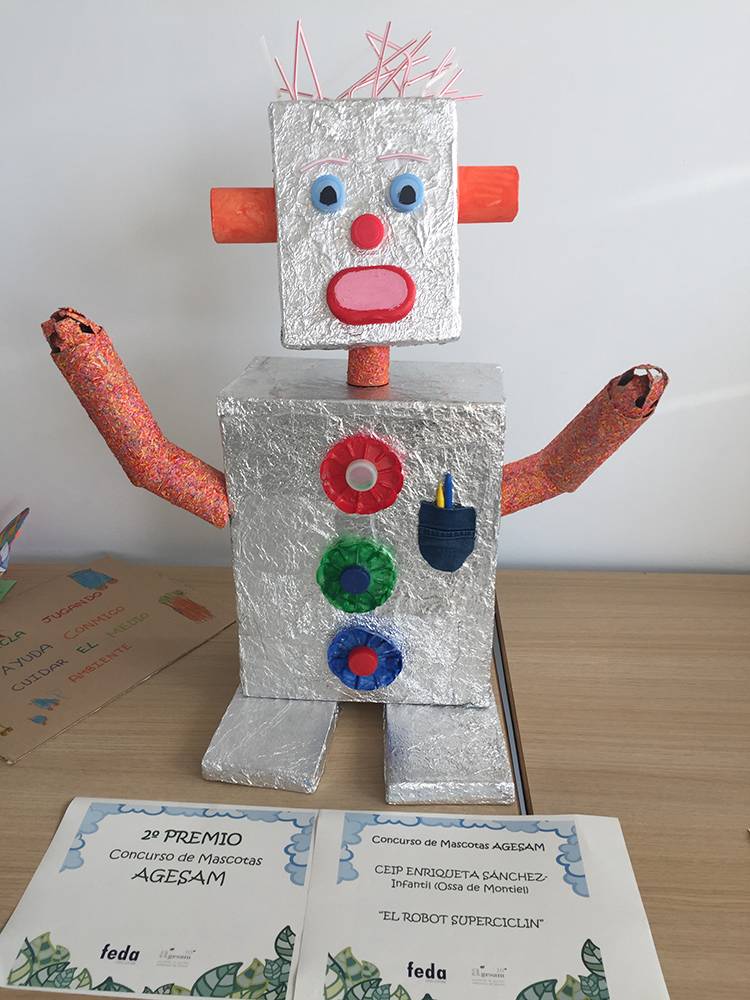 - 2º premio de 300 € à CEIP Enriqueta Sánchez (Ossa de Montiel). El ROBOT SUPERCICLIN, realizado por alumnos de Educación infantil (4 años) con el papel de los bocadillos que llevan a clase así como con otros materiales como tubos de rollos usados, pajitas, tapones, restos de ceras de colores, etc. Su lema es “Recicla jugando y ayuda conmigo a cuidar el medio ambiente”.