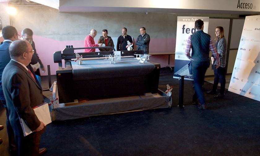 La maquinaria mostrada durante la exposición (celebrada en el parking de la sede de FEDA, c/ Zamora, 40) fue una mesa plana de corte para todo tipo de material que permite la fabricación de paneles, cajas, maquetas y cualquier otro tipo de estructuras según el material (cartón pluma, panal de abeja, etc.); y maquinaria de impresión de última tecnología con dos principales diferencias: el tipo de tintas utilizadas, ya que son tintas látex que permiten un secado más rápido a través de polimerización y el acabado de la impresión que ahorra el proceso de laminación.