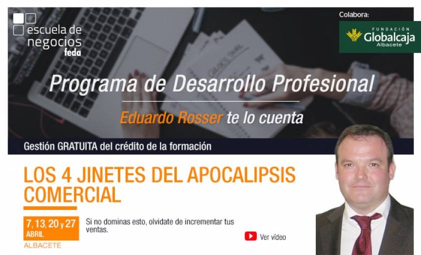 Este seminario, bajo el título “Los 4 jinetes del apocalipsis comercial: Captación, cierre, fidelización y engagement comercial”, se desarrollará en cuatro sesiones. La primera de ellas mañana jueves, día 7 de abril, y las tres siguientes los días 13, 20 y 23 de abril, en horario de mañana y tarde, con un total de 32 horas.