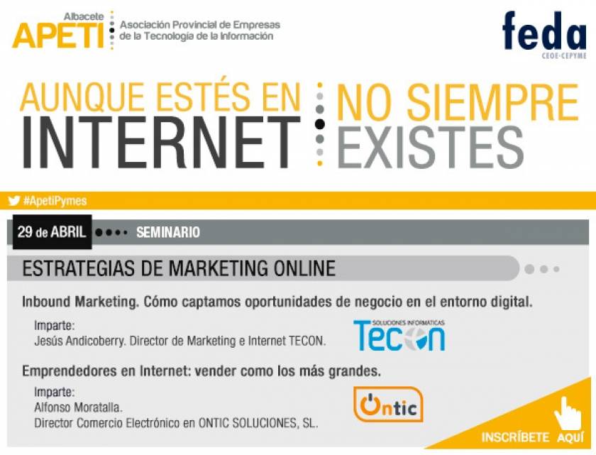 Tras celebrar con éxito la jornada del 31 de marzo con un caso de éxito, la Asociación Provincial de Empresas de la Tecnología de la Información (APETI) integrada en FEDA, celebró el pasado 15 de abril el primer seminario “Conceptos clave y aplicaciones marketing online” dentro del ciclo “Aunque estés en internet no siempre existes”, con impacto de interés en las empresas de Albacete. En el que se trasladaron los conceptos clave y herramientas digitales en la implementación de las nuevas tecnologías, donde pudimos ver un curiosísimo caso de éxito de una empresa albaceteña que ha conseguido aumentar su facturación a través de su tienda online.