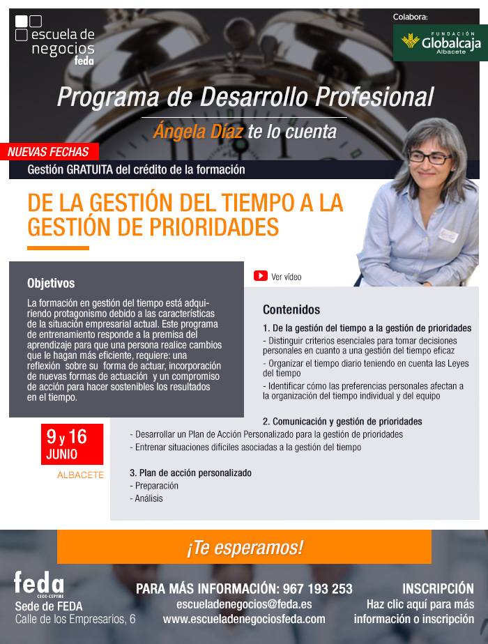 Los días 9 y 16 de junio tendrán lugar las dos sesiones, respectivamente, del sexto y último seminario del Programa de Desarrollo Profesional de Escuela de Negocios FEDA. Un programa que se ejecuta con la colaboración de la Fundación Globalcaja Albacete.