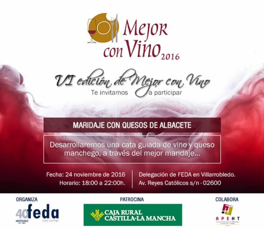 El próximo jueves, día 24 de noviembre, con la colaboración de Caja Rural Castilla-La Mancha, FEDA ha convocado en su sede de Villarrobledo (Avda. Reyes Católicos, s/n) la VI Edición de Mejor con Vino, una experiencia del maridaje de vinos y quesos de la provincia de Albacete. Los auténticos sabores de esta tierra.