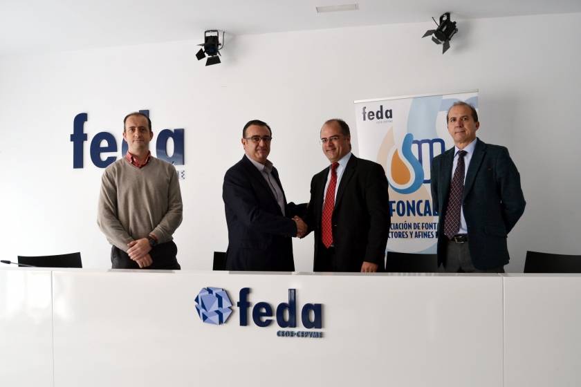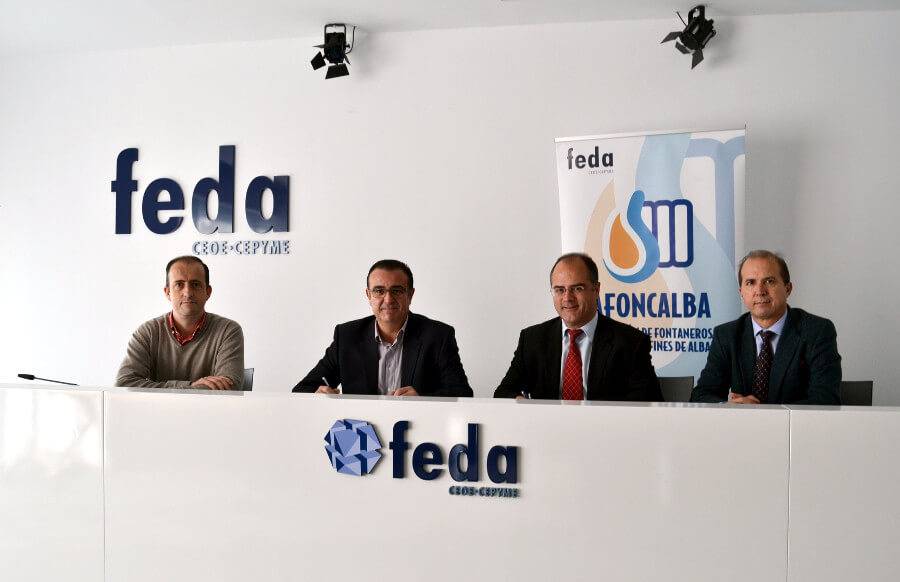 El presidente de la Asociación de Fontaneros, Calefactores y afines de Albacete (AFONCALBA), integrada en FEDA, Juan Manuel García, y el director general de Gas Natural Castilla-La Mancha, Miguel Martín de Pinto, han firmado este jueves un convenio de colaboración para mejorar la formación de sus asociados sobre eficiencia energética y cuestiones técnicas relacionadas con el gas natural y su plan de expansión en Albacete.