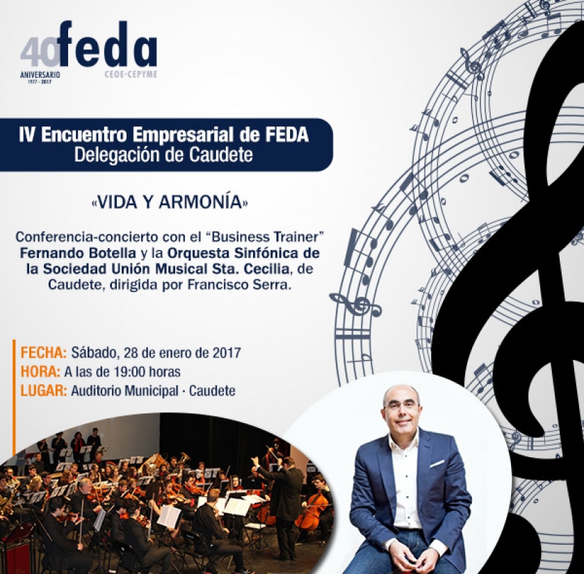 FEDA ha convocado para este sábado, 28 de enero, el IV Encuentro Empresarial de su Delegación en Caudete. Será una conferencia-concierto del “business trainer” Fernando Botella, profesor de Escuela de Negocios FEDA, titulada “Vida y armonía”, y en la que estará acompañado de la Orquesta Sinfónica de la Sociedad Musical Santa Cecilia de la localidad cuadetana. Será a las 19,00 horas, en el Auditorio Municipal.