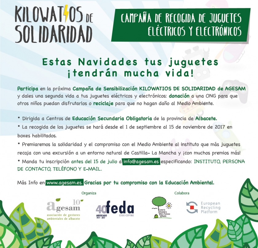 La Asociación de Gestores Ambientales de Albacete (AGESAM), integrada en FEDA, lanza su segundo proyecto orientado a la concienciación en la cultura del reciclaje con su campaña de sensibilización “Kilowatios de Solidaridad”. Se trata de una campaña de recogida de juguetes eléctricos y electrónicos (aquellos con pilas o baterías) dirigida a los centros de Educación Secundaria Obligatoria (E.S.O) de toda la provincia de Albacete y que cuenta con la colaboración del Consorcio de Medio Ambiente de la Diputación de Albacete y de European Reciclyng Plarform.