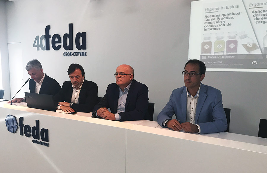 FEDA, junto a su Asociación de Prevención de Albacete, APRA, ha presentado esta mañana el Programa de Formación Práctica en Prevención de Riesgos Laborales. En esta presentación, el presidente de FEDA, Artemio Pérez, ha estado acompañado por el delegado de la Junta, Pedro Antonio Ruiz Santos, junto al presidente de APRA, Valentín Pérez García, y el secretario general de la Confederación, Vicente García Martínez.