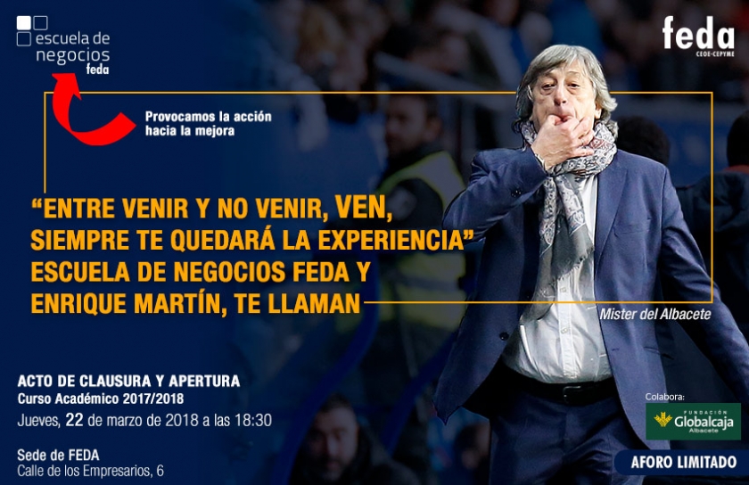 Escuela de Negocios FEDA celebrará el próximo jueves, día 22 de marzo, el acto de clausura y apertura de su Curso Académico 2017-2018, con la colaboración de la Fundación Globalcaja-Albacete. En este evento, el entrenador del Albacete Balompié, Enrique Martín, hablará de motivación y gestión de equipos a los empresarios de FEDA, con una conferencia que provocará la acción hacia la mejora. El lema del míster para este encuentro con empresarios y emprendedores es “Entre venir y no venir, ven; siempre te quedará la experiencia”, siguiendo su reclamo para con la afición del Alba.