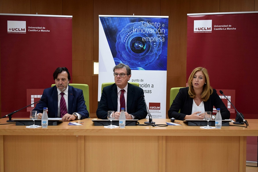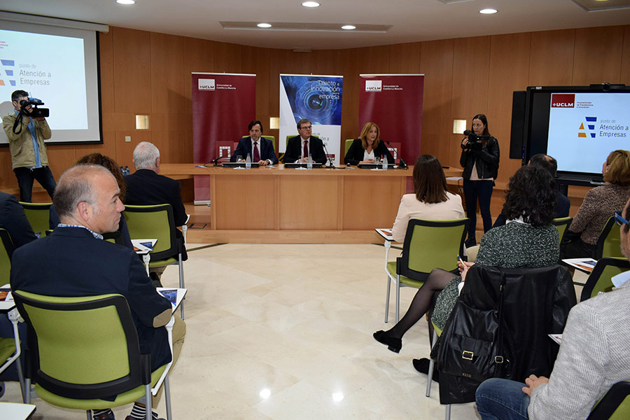 Potenciar el talento y la riqueza de las empresas y de la sociedad es el principal objetivo que persigue el Punto de Atención a Empresas de la Universidad de Castilla-La Mancha (UCLM). Una plataforma web y de atención personalizada para todos los campus de la Universidad regional, que ha sido presentada por el rector de la UCLM, Miguel Ángel Collado, en el Campus de Albacete, acompañado del presidente de FEDA y vicepresidente de CECAM, Artemio Pérez Alfaro, junto a la vicerrectora de Transferencia e Innovación, Angela González.