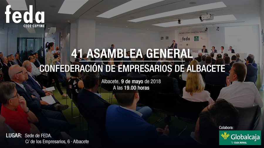 La Confederación de Empresarios de Albacete, FEDA, que preside Artemio Pérez Alfaro, celebrará mañana miércoles, día 9 de mayo, su 41 Asamblea General, en su sede de Albacete (c/ de los Empresarios, 6). Una convocatoria asamblearia que se desarrollará una vez superadas las cuatro décadas de representación y servicio a las empresas y autónomos de la provincia de Albacete.