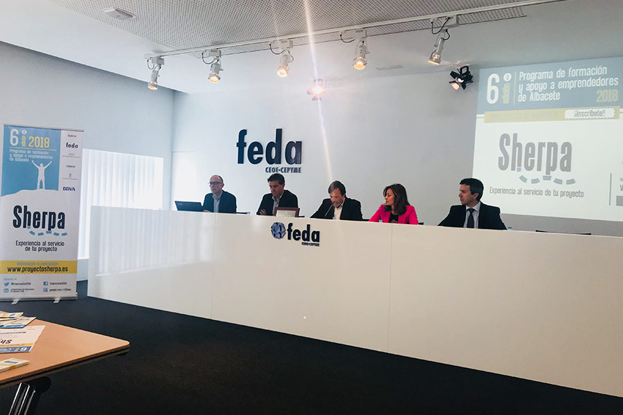 Los emprendedores de la provincia de Albacete, aquellas personas que tengan el sueño de hacer realidad una aventura empresarial, tienen una nueva cita con el Programa Sherpa’2018. La VI Edición ha sido presentada esta mañana por el presidente de FEDA, Artemio Pérez Alfaro; junto al presidente de la Diputación, Santiago Cabañero; la concejala de Promoción Económica del Ayuntamiento de Albacete, Rosa González; y Pablo Peinado, director de Centro de Banca de Clientes de Albacete Ciudad de BBVA, con instituciones y entidad que forman parte de este programa de apoyo a emprendedores.