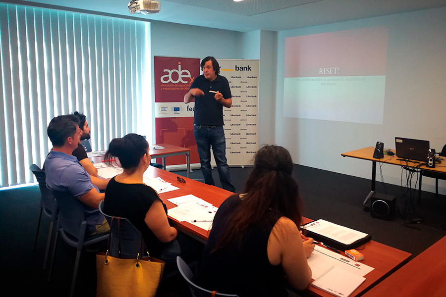 El taller de ocho horas que se ha organizado en FEDA, gracias a la colaboración de Liberbank y la dirección técnica de ADIEX, contó nuevamente con Pablo Vergel, un formador que de manera práctica demuestra a los alumnos como deben relacionarse con el inglés a través de distintas actividades y dinámicas, a la vez que se establece una hoja de ruta para desarrollar de manera cotidiana y que es la verdadera esencia del curso.