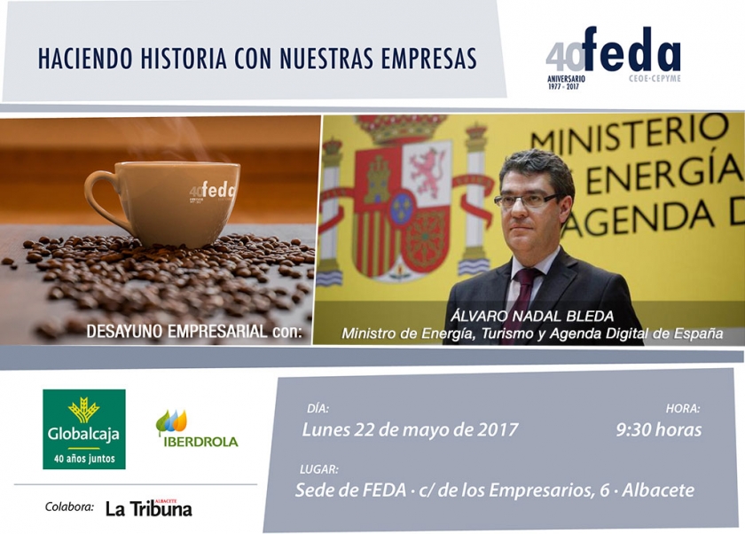Dentro de la agenda prevista con motivo del 40 Aniversario de FEDA, el próximo lunes, día 22 de mayo, a las 9,30 horas, y en la sede de los empresarios, el ministro de Energía, Turismo y Agenda Digital, Álvaro Nadal Belda, compartirá un desayuno empresarial.