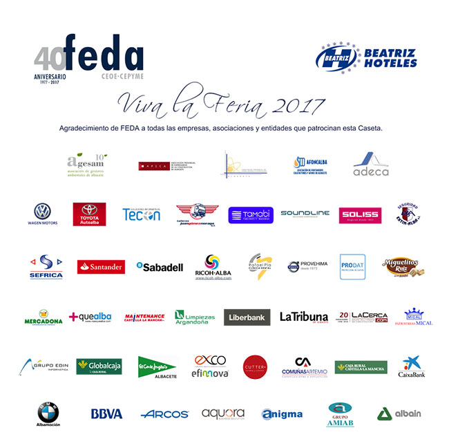 En la Caseta FEDA, un año más, convivirán marcas de empresas y entidades pertenecientes al ámbito empresarial, que reforzarán la presencia del mundo de la empresa en nuestra Feria. Y que tendrán a la Caseta FEDA como marco para el intercambio de impresiones durante los días festivos.