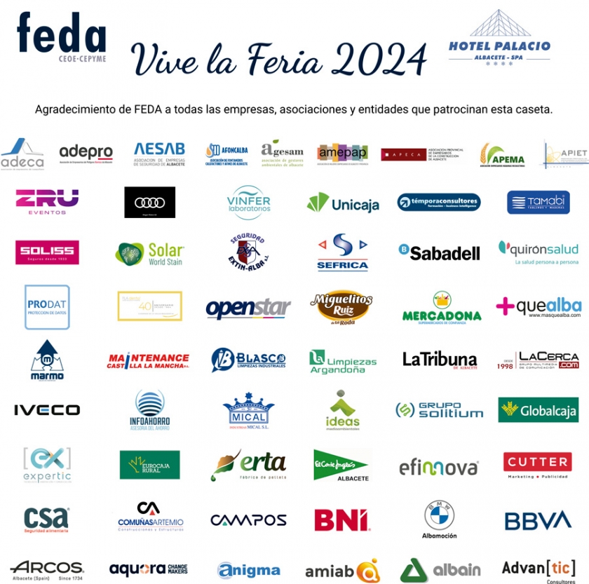 Caseta FEDA en la Feria de Albacete'2024. Una Caseta que será nuevamente un punto de encuentro empresarial, familiar y de la sociedad de Albacete y que tendrá la actividad y dinamismo que nosotros impregnemos con nuestra asistencia. Sin lugar a dudas, será un espacio muy agradable.