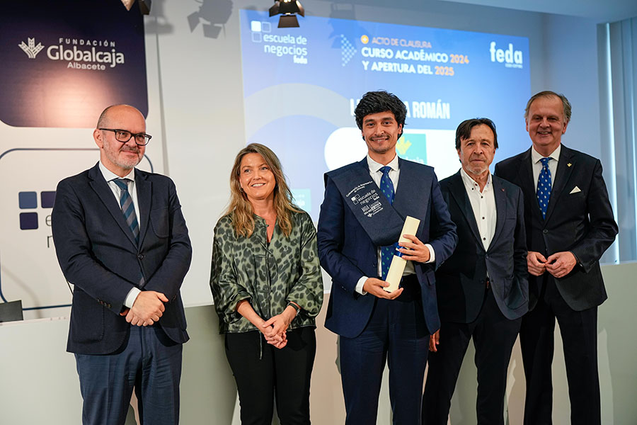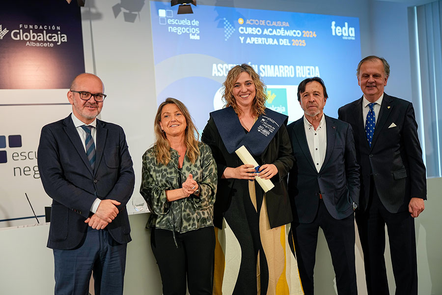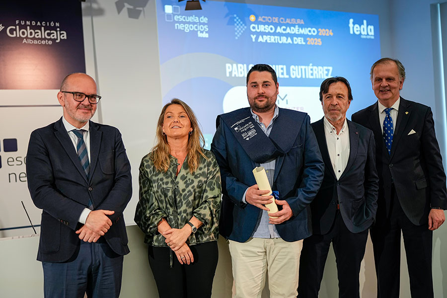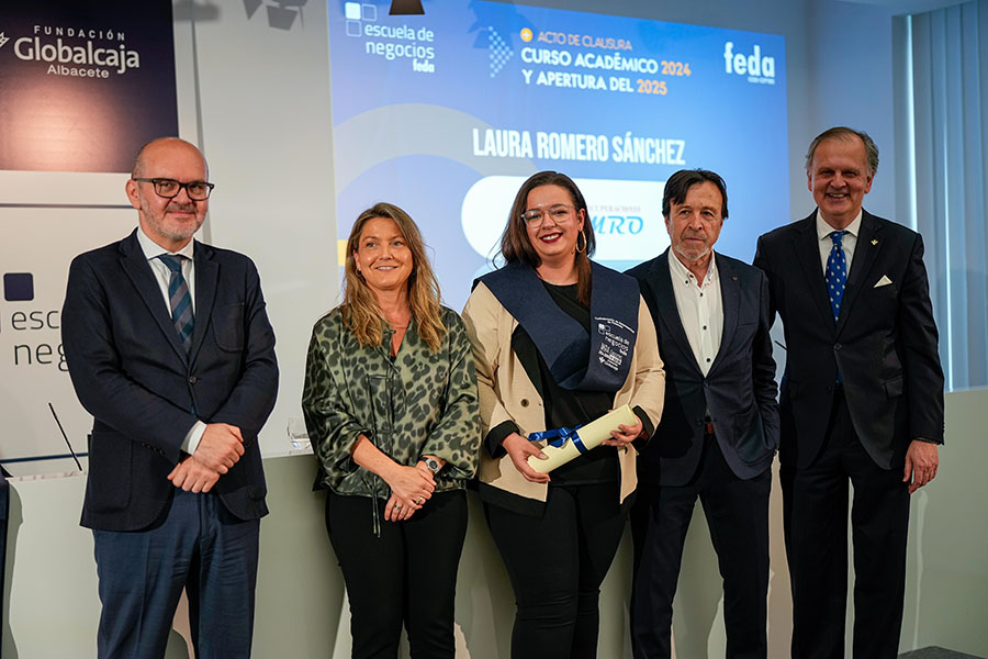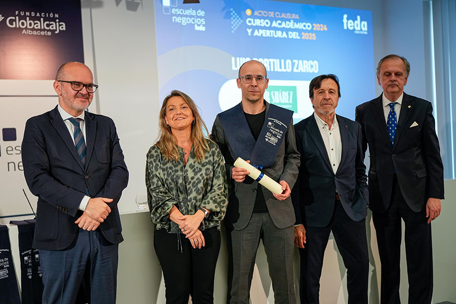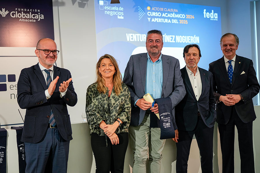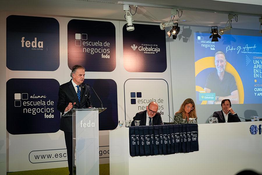 El presidente de FEDA, Artemio Pérez Alfaro, abrió la parte institucional del Acto de Clausura del Curso Académico 2024-2025 de Escuela de Negocios FEDA, dando la enhorabuena “a los alumnos y alumnas por vuestra dedicación a formarse”, señalando que “Escuela de Negocios FEDA ha recogido para la empresa de Albacete un objetivo muy importante: que el desarrollo de habilidades como la empatía, la creatividad, el pensamiento crítico o el trabajo en equipo cobran cada vez más importancia”, ya que “en estos tiempos de incertidumbre, el mundo empresarial demanda profesionales preparados y competentes, capaces de adaptarse a los cambios y de liderar el camino hacia un futuro próspero y sostenible. El mundo de los negocios está en constante evolución y es necesario mantenerse actualizado para no quedarse atrás”.