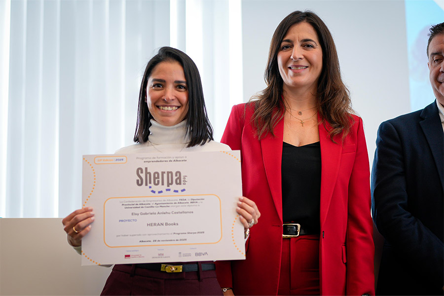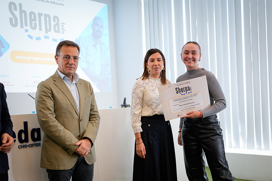 La sede de la Confederación ha acogido el acto de clausura de esta nueva edición del programa Sherpa, en el que se han dado a conocer los cuatro proyectos premiados en esta décimo tercera edición. La clausura ha contado con la presencia de Artemio Pérez Alfaro, presidente de la Confederación; Ana Escribano, directora académica del Vicerrectorado de Innovación, Coordinación y Desarrollo Institucional de la UCLM; la directora Centro Banca Clientes BBVA, Maribel Villar; Santiago Cabañero, presidente de la Diputación Provincial de Albacete; y Manuel Serrano, alcalde de Albacete. También han asistido el vicepresidente de la Diputación, Fran Valera; y el concejala de Emprendimiento, Lucrecia Rodriguez de Vera.