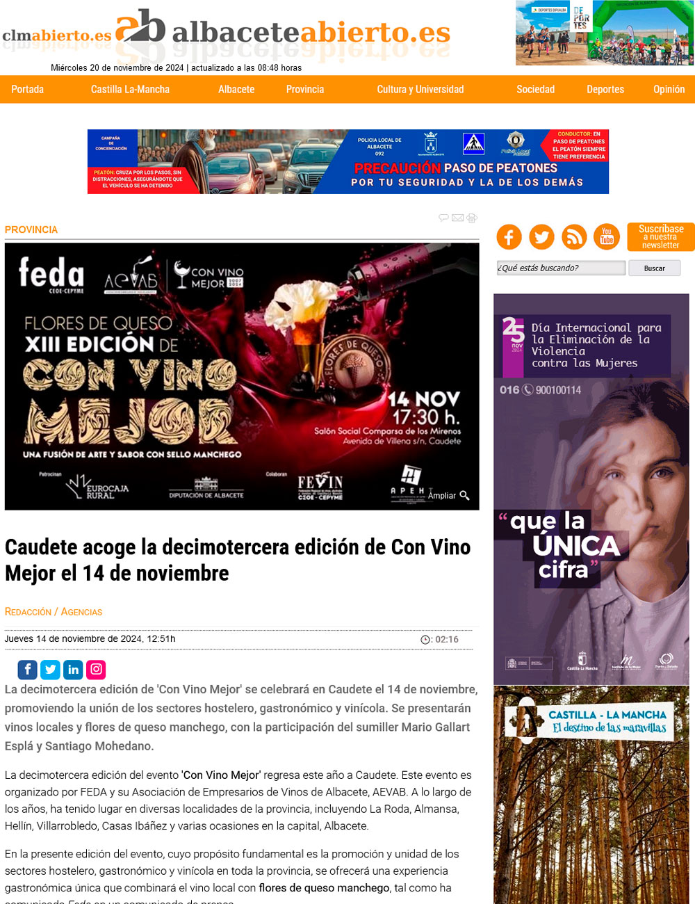 - Albacete Abierto: Caudete acoge la decimotercera edición de Con Vino Mejor el 14 de noviembre.
